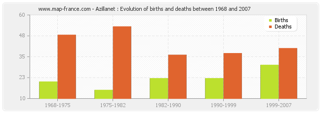 Azillanet : evolution of births and deaths from 1968 to 2007