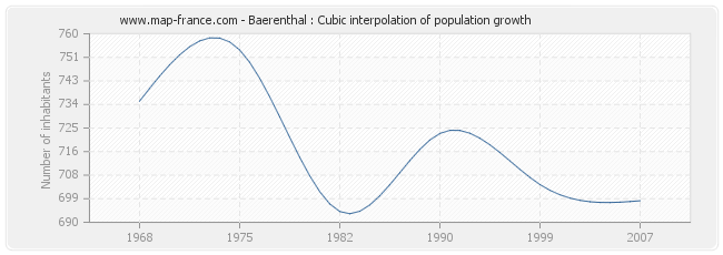 This curve shows the history of the population of Baerenthal from 1968 to 2007 in cubic interpolation. This provides more precisely the population of the municipality of Baerenthal the years where no census has been taken.