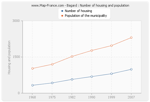 The population of Bagard was 2 305 inhabitants in 2007, 1 972 inhabitants in 1999, 1 771 inhabitants in 1990, 1 523 inhabitants in 1982, 1 198 inhabitants in 1975 and 1 025 inhabitants in 1968. Meanwhile, the number of housing of Bagard was 988 in 2007, 806 in 1999, 687 in 1990, 570 in 1982, 424 in 1975 and 327 in 1968.