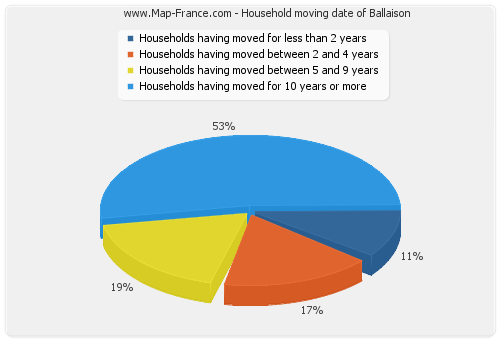 - Number of households of Ballaison having moved between 2 and 5 years : 83 - Number of households of Ballaison having moved between 5 and 9 years : 90 - Number of households of Ballaison having moved for 10 years or more : 258 |
