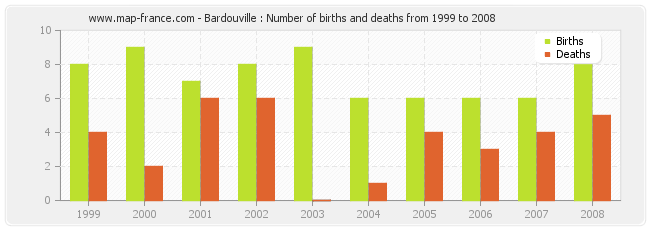 Bardouville : evolution of births and deaths from 1968 to 2007