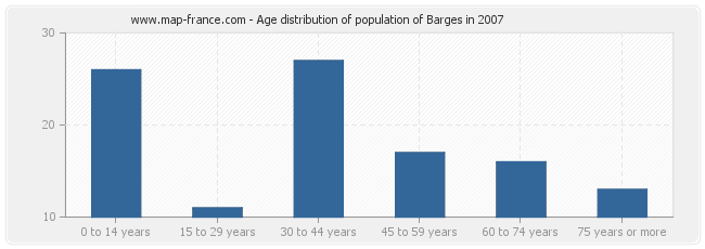 - Population of Barges from 30 to 44 years : 27 inhabitants