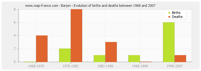 Population of Barjon was 42 inhabitants in 2007, 37 inhabitants in 1999, 34 inhabitants in 1990, 32 inhabitants in 1982, 32 inhabitants in 1975 and 42 inhabitants in 1968.