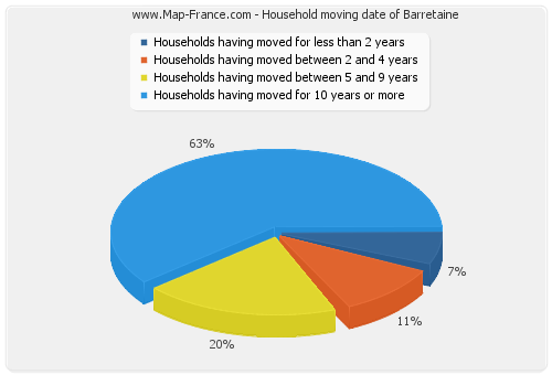 - Number of households of Barretaine having moved between 2 and 5 years : 8 - Number of households of Barretaine having moved between 5 and 9 years : 15 - Number of households of Barretaine having moved for 10 years or more : 47 |
