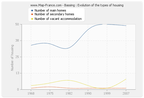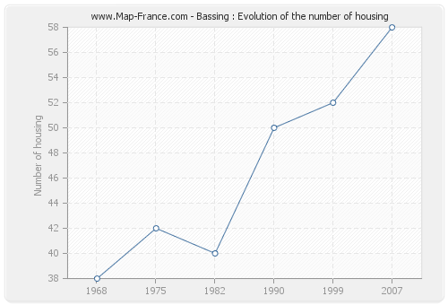 The number of housing of Bassing was 58 in 2007, 52 in 1999, 50 in 1990, 40 in 1982, 42 in 1975 and 38 in 1968.