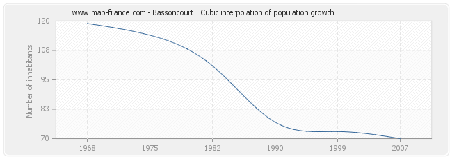 Population of Bassoncourt was 70 inhabitants in 2007, 73 inhabitants in 1999, 77 inhabitants in 1990, 101 inhabitants in 1982, 114 inhabitants in 1975 and 119 inhabitants in 1968.