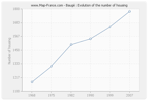 The number of housing of Baugé was 1 779 in 2007, 1 648 in 1999, 1 546 in 1990, 1 497 in 1982, 1 313 in 1975 and 1 181 in 1968.