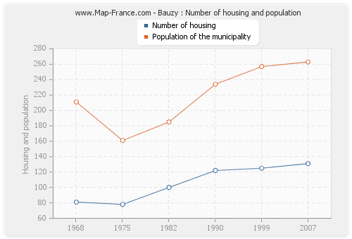 The population of Bauzy was 263 inhabitants in 2007, 257 inhabitants in 1999, 234 inhabitants in 1990, 185 inhabitants in 1982, 161 inhabitants in 1975 and 211 inhabitants in 1968. Meanwhile, the number of housing of Bauzy was 131 in 2007, 125 in 1999, 122 in 1990, 100 in 1982, 78 in 1975 and 81 in 1968.