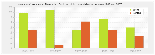 Bazenville : evolution of births and deaths from 1968 to 2007