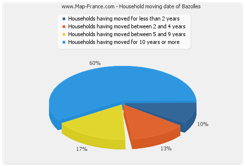 - Number of households of Bazolles having moved between 2 and 5 years : 16 - Number of households of Bazolles having moved between 5 and 9 years : 21 - Number of households of Bazolles having moved for 10 years or more : 74 |