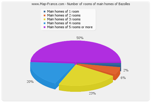 - Number of main homes of Bazolles of 1 room : 2 - Number of main homes of Bazolles of 2 rooms : 7 - Number of main homes of Bazolles of 3 rooms : 28 - Number of main homes of Bazolles of 4 rooms : 28 - Number of main homes of Bazolles of 5 rooms and more : 61 |