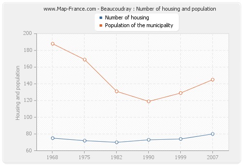 The population of Beaucoudray was 145 inhabitants in 2007, 129 inhabitants in 1999, 119 inhabitants in 1990, 131 inhabitants in 1982, 169 inhabitants in 1975 and 188 inhabitants in 1968. Meanwhile, the number of housing of Beaucoudray was 80 in 2007, 74 in 1999, 73 in 1990, 70 in 1982, 72 in 1975 and 75 in 1968.