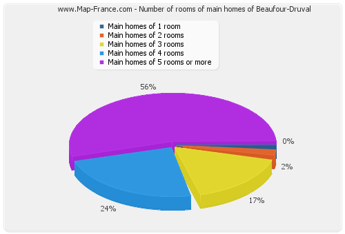 - Number of main homes of Beaufour-Druval of 1 room : 0 - Number of main homes of Beaufour-Druval of 2 rooms : 3 - Number of main homes of Beaufour-Druval of 3 rooms : 27 - Number of main homes of Beaufour-Druval of 4 rooms : 27 - Number of main homes of Beaufour-Druval of 5 rooms and more : 88 |
