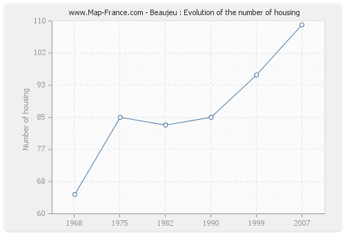The number of housing of Beaujeu was 109 in 2007, 96 in 1999, 85 in 1990, 83 in 1982, 85 in 1975 and 65 in 1968.