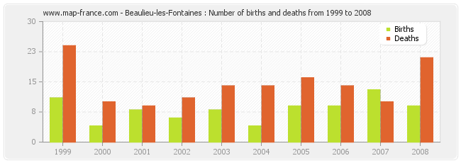 - Beaulieu-les-Fontaines in 2008 : 9 births and 21 deaths