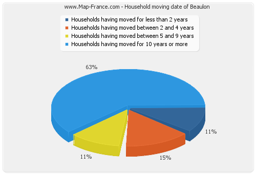 - Number of households of Beaulon having moved between 2 and 5 years : 104 - Number of households of Beaulon having moved between 5 and 9 years : 82 - Number of households of Beaulon having moved for 10 years or more : 452 |