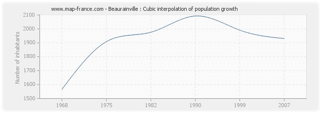Population of Beaurainville was 1 931 inhabitants in 2007, 1 991 inhabitants in 1999, 2 093 inhabitants in 1990, 1 976 inhabitants in 1982, 1 909 inhabitants in 1975 and 1 566 inhabitants in 1968.