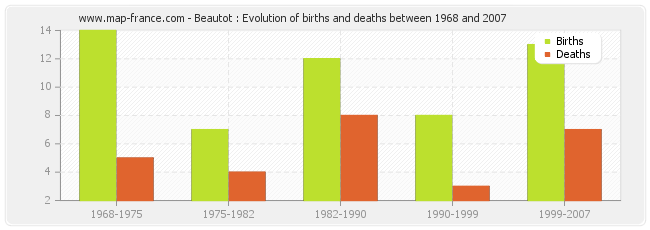 Population of Beautot was 115 inhabitants in 2007, 106 inhabitants in 1999, 118 inhabitants in 1990, 112 inhabitants in 1982, 120 inhabitants in 1975 and 121 inhabitants in 1968.