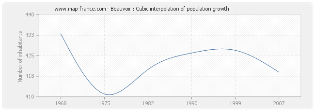 This curve shows the history of the population of Beauvoir from 1968 to 2007 in cubic interpolation. This provides more precisely the population of the municipality of Beauvoir the years where no census has been taken.