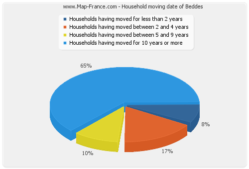 - Number of households of Beddes having moved between 2 and 5 years : 8 - Number of households of Beddes having moved between 5 and 9 years : 5 - Number of households of Beddes having moved for 10 years or more : 31 |