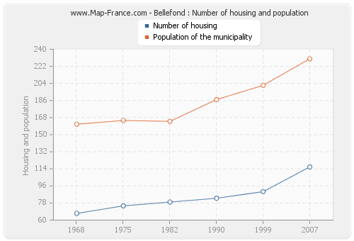 The population of Bellefond was 230 inhabitants in 2007, 202 inhabitants in 1999, 187 inhabitants in 1990, 164 inhabitants in 1982, 165 inhabitants in 1975 and 161 inhabitants in 1968. Meanwhile, the number of housing of Bellefond was 116 in 2007, 90 in 1999, 83 in 1990, 79 in 1982, 75 in 1975 and 67 in 1968.