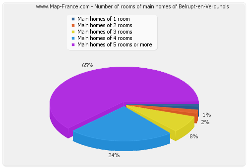 - Number of main homes of Belrupt-en-Verdunois of 1 room : 2 - Number of main homes of Belrupt-en-Verdunois of 2 rooms : 3 - Number of main homes of Belrupt-en-Verdunois of 3 rooms : 14 - Number of main homes of Belrupt-en-Verdunois of 4 rooms : 14 - Number of main homes of Belrupt-en-Verdunois of 5 rooms and more : 114 |