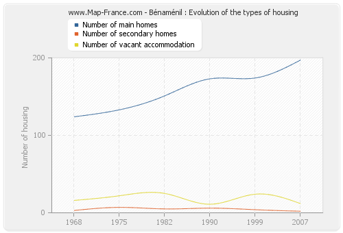 The following graphs show the history of the number and the type of housing of Bénaménil from 1968 to 2007. The second graph is drawn in cubic interpolation. This allows to obtain more exactly the number of accommodation of the town of Bénaménil years where no inventory was made.