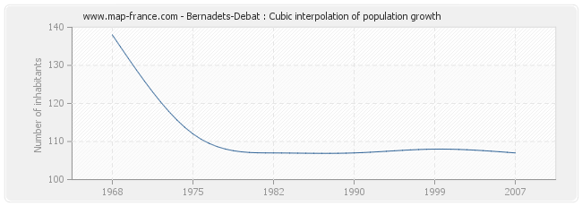 This curve shows the history of the population of Bernadets-Debat from 1968 to 2007 in cubic interpolation. This provides more precisely the population of the municipality of Bernadets-Debat the years where no census has been taken.