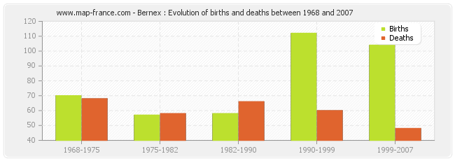 Bernex : evolution of births and deaths from 1968 to 2007