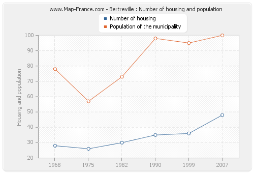 The population of Bertreville was 100 inhabitants in 2007, 95 inhabitants in 1999, 98 inhabitants in 1990, 73 inhabitants in 1982, 57 inhabitants in 1975 and 78 inhabitants in 1968. Meanwhile, the number of housing of Bertreville was 48 in 2007, 36 in 1999, 35 in 1990, 30 in 1982, 26 in 1975 and 28 in 1968.