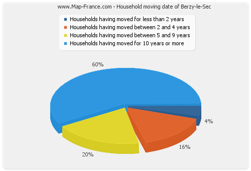 - Number of households of Berzy-le-Sec having moved between 2 and 5 years : 25 - Number of households of Berzy-le-Sec having moved between 5 and 9 years : 31 - Number of households of Berzy-le-Sec having moved for 10 years or more : 94 |