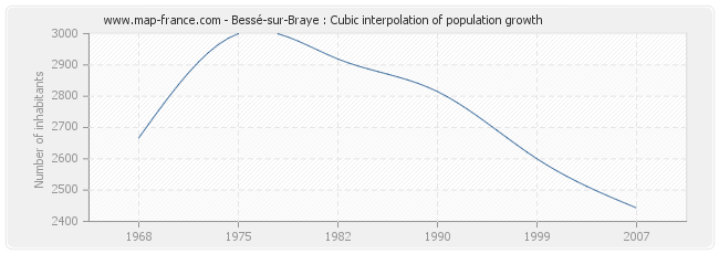 Population of Bessé-sur-Braye was 2 443 inhabitants in 2007, 2 600 inhabitants in 1999, 2 815 inhabitants in 1990, 2 919 inhabitants in 1982, 3 000 inhabitants in 1975 and 2 667 inhabitants in 1968.