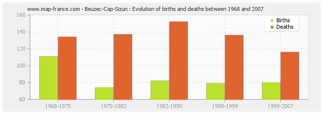 Beuzec-Cap-Sizun : evolution of births and deaths from 1968 to 2007