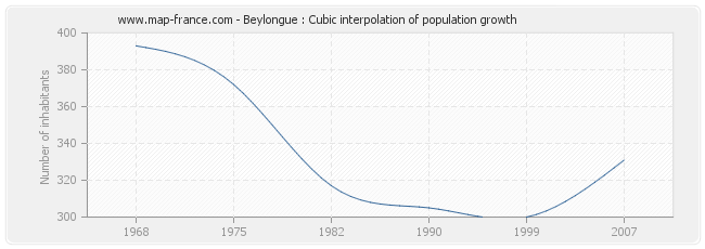 This curve shows the history of the population of Beylongue from 1968 to 2007 in cubic interpolation. This provides more precisely the population of the municipality of Beylongue the years where no census has been taken.