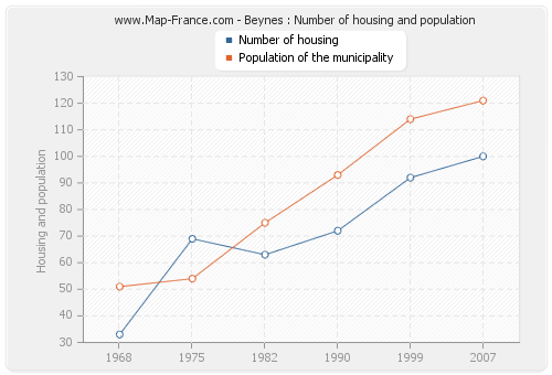 The population of Beynes was 121 inhabitants in 2007, 114 inhabitants in 1999, 93 inhabitants in 1990, 75 inhabitants in 1982, 54 inhabitants in 1975 and 51 inhabitants in 1968. Meanwhile, the number of housing of Beynes was 100 in 2007, 92 in 1999, 72 in 1990, 63 in 1982, 69 in 1975 and 33 in 1968.