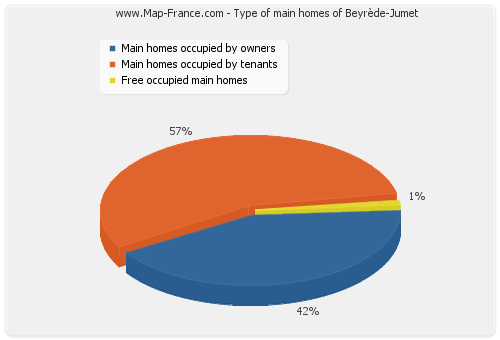 - Number of main homes of Beyrède-Jumet occupied by owners : 38 - Number of main homes of Beyrède-Jumet occupied by tenants : 51 - Number of main homes of Beyrède-Jumet occupied free of charge : 1 |