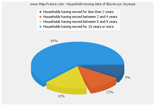 - Number of households of Beyrie-sur-Joyeuse having moved between 2 and 5 years : 20 - Number of households of Beyrie-sur-Joyeuse having moved between 5 and 9 years : 27 - Number of households of Beyrie-sur-Joyeuse having moved for 10 years or more : 111 |