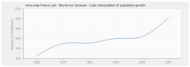 Population of Beyrie-sur-Joyeuse was 501 inhabitants in 2007, 464 inhabitants in 1999, 460 inhabitants in 1990, 451 inhabitants in 1982, 450 inhabitants in 1975 and 425 inhabitants in 1968.