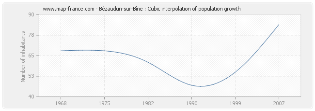 This curve shows the history of the population of Bézaudun-sur-Bîne from 1968 to 2007 in cubic interpolation. This provides more precisely the population of the municipality of Bézaudun-sur-Bîne the years where no census has been taken.
