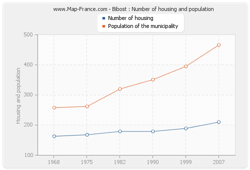 The population of Bibost was 466 inhabitants in 2007, 395 inhabitants in 1999, 351 inhabitants in 1990, 320 inhabitants in 1982, 262 inhabitants in 1975 and 258 inhabitants in 1968. Meanwhile, the number of housing of Bibost was 210 in 2007, 189 in 1999, 179 in 1990, 179 in 1982, 168 in 1975 and 163 in 1968.