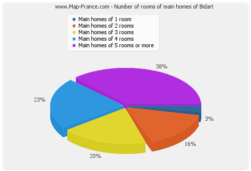 - Number of main homes of Bidart of 1 room : 67 - Number of main homes of Bidart of 2 rooms : 410 - Number of main homes of Bidart of 3 rooms : 487 - Number of main homes of Bidart of 4 rooms : 487 - Number of main homes of Bidart of 5 rooms and more : 951 |