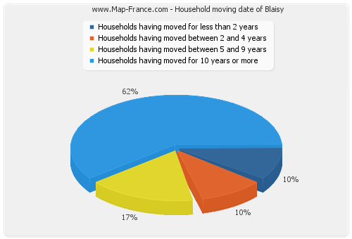 - Number of households of Blaisy having moved between 2 and 5 years : 3 - Number of households of Blaisy having moved between 5 and 9 years : 5 - Number of households of Blaisy having moved for 10 years or more : 18 |