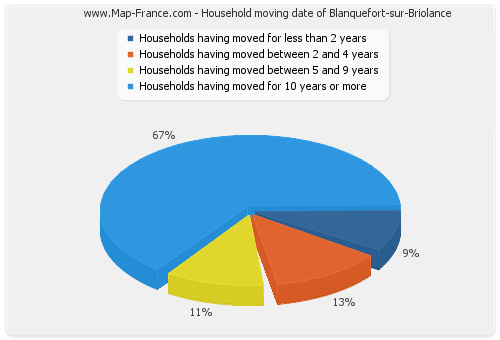 - Number of households of Blanquefort-sur-Briolance having moved between 2 and 5 years : 27 - Number of households of Blanquefort-sur-Briolance having moved between 5 and 9 years : 24 - Number of households of Blanquefort-sur-Briolance having moved for 10 years or more : 143 |