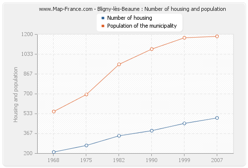 The population of Bligny-lès-Beaune was 1 183 inhabitants in 2007, 1 171 inhabitants in 1999, 1 076 inhabitants in 1990, 948 inhabitants in 1982, 695 inhabitants in 1975 and 552 inhabitants in 1968. Meanwhile, the number of housing of Bligny-lès-Beaune was 498 in 2007, 452 in 1999, 391 in 1990, 348 in 1982, 267 in 1975 and 212 in 1968.