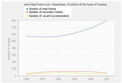 The following graphs show the history of the number and the type of housing of Boeschepe from 1968 to 2007. The second graph is drawn in cubic interpolation. This allows to obtain more exactly the number of accommodation of the city of Boeschepe years where no inventory was made.