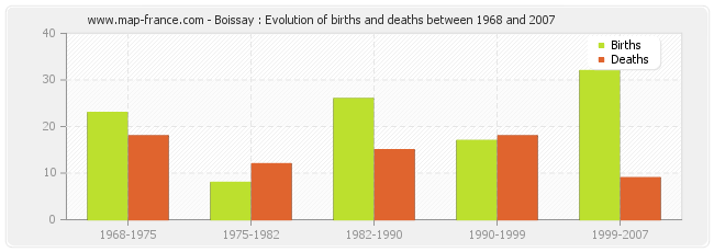 Population of Boissay was 291 inhabitants in 2007, 267 inhabitants in 1999, 241 inhabitants in 1990, 213 inhabitants in 1982, 203 inhabitants in 1975 and 199 inhabitants in 1968.