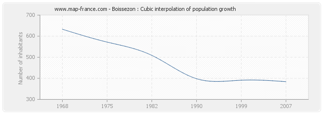 This curve shows the history of the population of Boissezon from 1968 to 2007 in cubic interpolation. This provides more precisely the population of the municipality of Boissezon the years where no census has been taken.