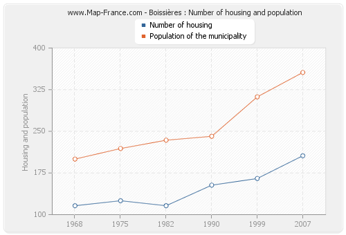 The population of Boissières was 356 inhabitants in 2007, 312 inhabitants in 1999, 241 inhabitants in 1990, 234 inhabitants in 1982, 219 inhabitants in 1975 and 200 inhabitants in 1968. Meanwhile, the number of housing of Boissières was 206 in 2007, 165 in 1999, 153 in 1990, 116 in 1982, 125 in 1975 and 116 in 1968.