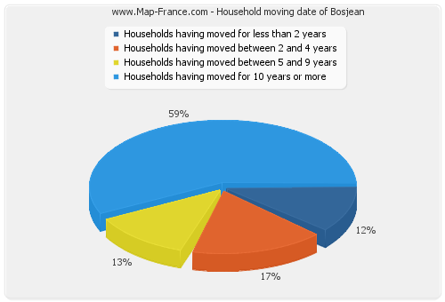- Number of households of Bosjean having moved between 2 and 5 years : 23 - Number of households of Bosjean having moved between 5 and 9 years : 17 - Number of households of Bosjean having moved for 10 years or more : 80 |