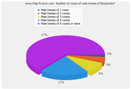- Number of main homes of Bossendorf of 1 room : 0 - Number of main homes of Bossendorf of 2 rooms : 5 - Number of main homes of Bossendorf of 3 rooms : 11 - Number of main homes of Bossendorf of 4 rooms : 11 - Number of main homes of Bossendorf of 5 rooms and more : 88 |